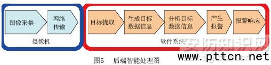 為適應(yīng)各種不同的網(wǎng)絡(luò)環(huán)境和應(yīng)用需求,比較高端的高清監(jiān)控?cái)z像機(jī)都配備強(qiáng)大的MJPG、MPEG-4、H.264三編碼引擎,同時(shí)具有靈活的雙碼流功能。 前端智能化 隨著監(jiān)控的高清化發(fā)展,圖像更清晰、更細(xì)致,高清也意味著海量數(shù)據(jù),這些海量數(shù)據(jù)的傳輸、顯示、處理、存儲(chǔ)是一個(gè)很大的挑戰(zhàn)。此外,目前的監(jiān)控系統(tǒng),更多的是依賴于監(jiān)視人員,存在很多無法解決的問題,是被動(dòng)式的監(jiān)控。因此,必須利用智能視頻分析的手段,將以往被動(dòng)監(jiān)控變更為主動(dòng)監(jiān)控,真正做到24小時(shí)全天候監(jiān)控,實(shí)現(xiàn)快速響應(yīng),防范于未然。 目前的智能視頻實(shí)現(xiàn)方式主要有兩種。 1、后端智能 后端處理(圖5),需要把高幀率、高分辨率的圖像全部送到后端的服務(wù)器進(jìn)行處理。這對(duì)網(wǎng)絡(luò)設(shè)施和服務(wù)器提出了非常高的要求,需要高額的投資,而且延時(shí)更大,處理效率比較低,系統(tǒng)的伸縮性較差。并且,由于分析的數(shù)據(jù)是壓縮后的數(shù)據(jù),因此準(zhǔn)確性相應(yīng)降低,如果受傳輸制約而降低傳輸帶寬,準(zhǔn)確性將進(jìn)一步降低。