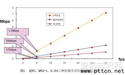 色彩還原 需要特別注意的是,高清電視與高清監(jiān)控?cái)z像機(jī)在圖像內(nèi)容處理上有很大的不同。高清電視強(qiáng)調(diào)整體的視覺沖擊力,除了在圖像分辨率上比標(biāo)清有很大的提升外,其色彩也更加豐富、艷麗、細(xì)膩,圖像層次感強(qiáng),根據(jù)SMPTE 292M高清電視標(biāo)準(zhǔn)及SMPTE 274M高清電視標(biāo)準(zhǔn),其色差信號(hào)占總帶寬的一半。 而高清監(jiān)控?cái)z像機(jī)則強(qiáng)調(diào)目標(biāo)的可識(shí)別性,即大幅度提升了圖像的分辨率,而相對(duì)弱化對(duì)色彩的處理,這樣處理的優(yōu)勢是在保證畫面的分辨率與可識(shí)別性的同時(shí),視頻信號(hào)的碼流得到了很好的控制。 圖像壓縮技術(shù) 目前在高清監(jiān)控?cái)z像機(jī)中被廣泛采用的圖像壓縮技術(shù)有MJPG、MPEG-4、H.264三種方式,圖3是這三種壓縮方式帶寬占用情況。每種壓縮方式有不同的特點(diǎn),如MJPG能獲得最高的單幅畫面質(zhì)量,且對(duì)攝像機(jī)本身的處理平臺(tái)要求也較低,但對(duì)連續(xù)圖像壓縮占用帶寬最大;H.264可以獲得最高的壓縮比,但對(duì)攝像機(jī)本身的處理平臺(tái)要求也最高。