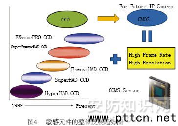 敏感元件與靈敏度 敏感元件是攝像機(jī)最為核心的部件,在模擬攝像機(jī)以及標(biāo)清網(wǎng)絡(luò)攝像機(jī)中,最為廣泛使用的敏感元件是CCD。CCD的特點(diǎn)是靈敏度高,但響應(yīng)速度較低,不適用于高清監(jiān)控?cái)z像機(jī)采用的高分辨率逐行掃描方式,因此高清監(jiān)控?cái)z像機(jī)普遍采用CMOS敏感元件。 對(duì)于相同尺寸的敏感元件,像素越高,意味著每個(gè)像素的進(jìn)光量越少,因此目前高清監(jiān)控?cái)z像機(jī)的突出問題是清晰度提高,靈敏度降低。幸運(yùn)的是,目前致力于CMOS研究的廠商已經(jīng)研發(fā)出720p與1080p專用的CMOS器件,其靈敏度性能已經(jīng)與CCD接近(敏感元件的整體發(fā)展趨勢可參見圖4)。