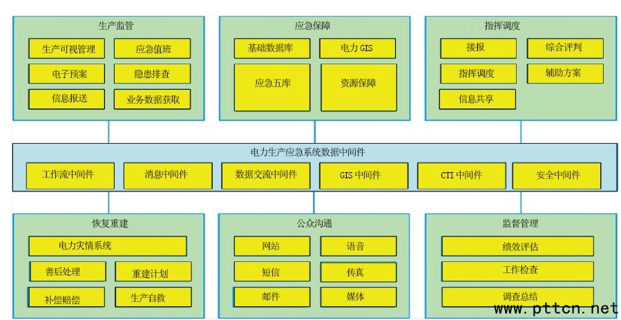 主頁(http://www.130131.com):電力視頻監(jiān)控系統(tǒng)組成 【中國集群通信網(wǎng)】一個完整的電力視頻監(jiān)控應(yīng)急系統(tǒng)包含6大應(yīng)用模塊(生產(chǎn)監(jiān)管、應(yīng)急保障、指揮調(diào)度、恢復(fù)重建、公眾溝通和監(jiān)督管理)和電力生產(chǎn)應(yīng)急系統(tǒng)數(shù)據(jù)中間件組成,如圖1所示,其中與日常電力生產(chǎn)過程監(jiān)管相關(guān)的是生產(chǎn)監(jiān)管應(yīng)用模塊,突發(fā)事件發(fā)生時,根據(jù)應(yīng)急級別的不同會使用到不同的6大應(yīng)用模塊。生產(chǎn)監(jiān)管模塊是整個系統(tǒng)的基礎(chǔ)。