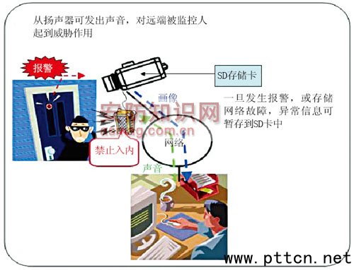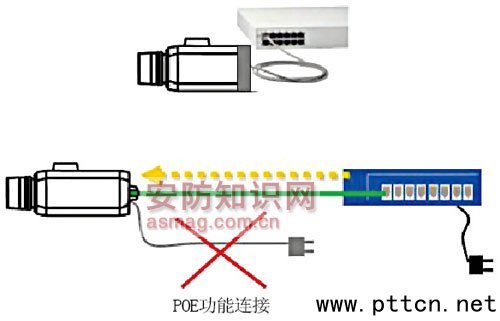 圖2 雙向語(yǔ)音實(shí)際應(yīng)用示意圖 支持PoE功能 PoE(Power Over Ethernet)以太網(wǎng)供電這項(xiàng)創(chuàng)新的技術(shù),是用一條通過(guò)以太網(wǎng)電纜同時(shí)傳輸以太網(wǎng)信號(hào)和直流電源,它將電源和數(shù)據(jù)集成在同一有線系統(tǒng)當(dāng)中,在確,F(xiàn)有結(jié)構(gòu)化布線安全的同時(shí),保證了現(xiàn)有網(wǎng)絡(luò)的正常運(yùn)作。PoE網(wǎng)絡(luò)攝像機(jī)具有以下優(yōu)點(diǎn): 1、PoE功能連接 ·施工上安裝簡(jiǎn)單,只需要布置一根雙絞線,不需要敷設(shè)電源線,可以省去昂貴的電源線,省去敷設(shè)電源線的工作量。布置點(diǎn)位相對(duì)比較自由,不用考慮電源取電的難題,只要網(wǎng)絡(luò)線可以到達(dá)的地方都可以安裝,減少安裝過(guò)程中考慮的因素(如圖3); ·PoE供電時(shí)不用單獨(dú)敷設(shè)220V的電源,減少信號(hào)的干擾導(dǎo)致圖像不清晰、衰減大的因素; ·采用集中供電方式,只需要對(duì)交換機(jī)進(jìn)行集中供電,供電的范圍比較集中,容易管理,成本較低; ·通過(guò)PoE供電,前端沒(méi)有強(qiáng)電,系統(tǒng)的安全性好,不會(huì)因?yàn)殡娫磫?wèn)題發(fā)生事故,尤其在安全性要求高的場(chǎng)所,優(yōu)勢(shì)更加明顯。PoE網(wǎng)絡(luò)攝像機(jī)增加網(wǎng)絡(luò)防雷模塊就可以保證前端設(shè)備在雷雨天氣的安全,網(wǎng)絡(luò)線不超過(guò)100米,不容易形成感應(yīng)電勢(shì)擊壞攝像機(jī)的電子元器件。