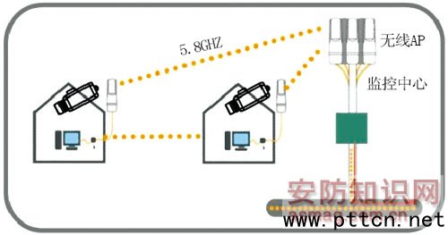圖3 帶POE功能網(wǎng)絡(luò)攝像機(jī)接線示意圖 2、支持無(wú)線功能 網(wǎng)絡(luò)攝像機(jī)不僅具備PoE功能可節(jié)省布線的成本和難度,有些廠家已經(jīng)在攝像機(jī)內(nèi)部增加無(wú)線網(wǎng)卡模塊或提供無(wú)線網(wǎng)卡的插槽,支持無(wú)線功能的攝像機(jī)可以接入無(wú)線AP實(shí)現(xiàn)采集前端視頻信息到后端的目的。現(xiàn)在支持無(wú)線傳輸?shù)募夹g(shù)有很多,WIFI、MESH、WIMAX等等,現(xiàn)在點(diǎn)對(duì)點(diǎn)傳輸距離可達(dá)到幾十公里以上(如圖4),可以滿足一些監(jiān)控的需求,但是要想使無(wú)線監(jiān)控今后成為主流,還需一段時(shí)間,取決于無(wú)線網(wǎng)絡(luò)的發(fā)展。