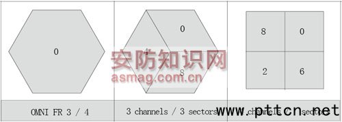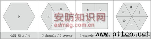 圖2 5.8GHZ頻段具體頻率值 在進(jìn)行單基站頻率配置時(shí),遵循圖3(10MHz)和圖4(20MHz)所示原則。圖中單基站配置分別為OMNI(360°)×1扇區(qū)、120°×3扇區(qū)、90°×4扇區(qū)和60°×6扇區(qū)。
