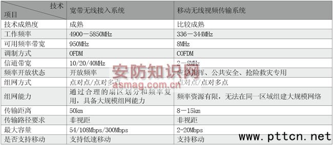 圖4 5.8GHz單基站頻率分配示意圖(20MHz) 在平安城市網(wǎng)絡(luò)建設(shè)初期,可采用120°×3扇區(qū)(20MHz)的單基站配置。每扇區(qū)空口容量54Mbps,每基站容量為162Mbps。后期如網(wǎng)絡(luò)容量需求擴(kuò)大,可使用90°×4扇區(qū),每基站容量將擴(kuò)大至216Mbps。 移動無線視頻傳輸系統(tǒng)可用頻率資源較少,提供帶寬低,從技術(shù)角度講,在平安城市建設(shè)中,移動無線視頻傳輸系統(tǒng)較難進(jìn)行大規(guī)模的組網(wǎng)(如使用8MHz/信道,可用信道僅1個(gè),無法進(jìn)行多扇區(qū)劃分和頻率復(fù)用;而如采用2MHz/信道,可用信道為4個(gè),可以考慮多扇區(qū)劃分和頻率復(fù)用,但由于信道帶寬減小4倍,相應(yīng)的系統(tǒng)容量也會減小4倍)。 兩種主要無線技術(shù)參數(shù)比較表 從表1可以看出,寬帶無線接入系統(tǒng)以其高容量、規(guī)模組網(wǎng)能力和長距離傳輸取勝,非常適合在平安城市傳輸網(wǎng)絡(luò)中的接入層、匯聚層(及部分骨干層)應(yīng)用,特別是在網(wǎng)絡(luò)的接入和匯聚節(jié)點(diǎn),可以作為光纖的替代來使用。