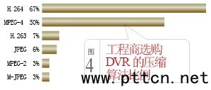 圖像更清晰 無(wú)論是用于實(shí)時(shí)監(jiān)看還是圖像回放,對(duì)于用戶(hù)來(lái)說(shuō),DVR是否具備清晰的監(jiān)看圖像和回放畫(huà)質(zhì)都是他們首要關(guān)注的因素。2004年,當(dāng)A&S首次對(duì)中國(guó)DVR產(chǎn)品進(jìn)行大調(diào)查的時(shí)候,工程商普遍反映DVR產(chǎn)品的圖像清晰度不夠。歷經(jīng)3年多的發(fā)展,在此次的DVR產(chǎn)品調(diào)查中,我們聽(tīng)到反饋更多的是,DVR產(chǎn)品的圖像及畫(huà)質(zhì)已經(jīng)有了質(zhì)的提升,并基本能滿(mǎn)足當(dāng)前視頻監(jiān)控系統(tǒng)的需求。視頻圖像質(zhì)量的好壞與很多因素都息息相關(guān),例如壓縮比、網(wǎng)絡(luò)傳輸效率、存儲(chǔ)容量等,而在有限的網(wǎng)絡(luò)帶寬環(huán)境下,采用何種壓縮算法直接決定著DVR產(chǎn)品的視頻圖像質(zhì)量。 從最早的單機(jī)模擬監(jiān)控系統(tǒng),發(fā)展到現(xiàn)在基于IP的視頻監(jiān)控系統(tǒng),國(guó)內(nèi)主要出現(xiàn)JPEG、M-JPEG、MPEG-2、MPEG-4,以及最新的H.264幾種壓縮格式。2004年,DVR產(chǎn)品主流的壓縮格式還是以MPEG-4為主,占據(jù)整個(gè)DVR市場(chǎng)的64%。而通過(guò)此次調(diào)查顯示,2007年,基于H.264算法而開(kāi)發(fā)的DVR產(chǎn)品已經(jīng)成為市場(chǎng)的主流,占到67%的市場(chǎng)份額,MPEG-4則反居其下,比例為50%(見(jiàn)圖4)。