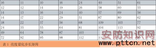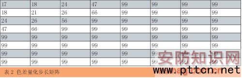 (2)編碼時(shí),先將一幀圖像分為互不重疊的8×8像素塊,接著對(duì)各塊進(jìn)行DCT變換,然后對(duì)各變換系數(shù)進(jìn)行線性量化。 量化步長Q應(yīng)結(jié)合人眼視覺敏感性,亮度和色差信號(hào)的量化步長矩陣見表1和表2。