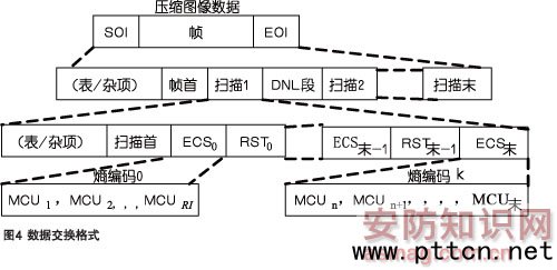 量化后系數(shù)為: 反量化后DCT系數(shù)為: (3)熵編碼,一般采用哈夫曼(VLC)編碼。AC系數(shù)量化后為少數(shù)稀疏的值,大部分為零,采用鋸齒形(Zig-Zag)掃描,然后以游程編碼表示方式進(jìn)行變長的哈夫曼編碼。 (4)數(shù)據(jù)交換格式 熵編碼后得到變長度的碼流。為便于數(shù)據(jù)的交換,JPEG規(guī)定了統(tǒng)一的壓縮后數(shù)據(jù)交換格式,如圖4所示。