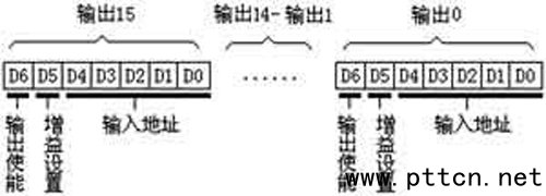 ![]() ▲圖3 模式0的16位控制字 當(dāng)MODE=1時,由16個7位組成的112位的控制字用來控制所有的輸出。112位控制字的組成如圖4所示。112位的控制字的第一個7位控制字對應(yīng)輸出15的編程,最后的7位控制字對應(yīng)輸出0的編程。當(dāng)UPDATE的下降沿時,串行輸入的112位控制字放入112位完整矩陣模式存儲器中,所有的輸出被更新。對于一個由n塊MAX4357組成的大型矩陣,這些芯片可以被一串Nx112位的串行數(shù)據(jù)流編程。