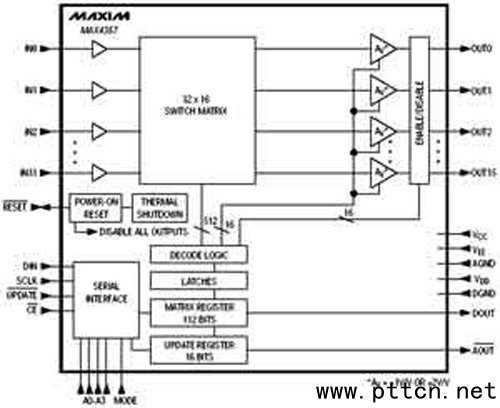 ![]() ▲圖1 MAX4357結(jié)構(gòu)框圖 MAX4357具有由512個獨(dú)立的電子開關(guān)構(gòu)成的開關(guān)矩陣,可以使其32路視頻輸入16路視頻輸出。這個矩陣切換是100%非阻塞的,通過一個SPI/QSPI兼容的三線接口寫入控制系列字,可以使能任意一路輸入和任意一路輸出連接,每一個輸出可以和32路模擬輸入信號中的任意一路連接,任意一路輸入可以沒有信號衰減的連通所有的16路輸出。 MAX4357的數(shù)字接口由以下引腳組成:DIN、DOUT、SCLK、AOUT、UPDATE、CE、A3~A0、MODE和RESET。DIN是串行數(shù)據(jù)輸入端,DOUT是串行數(shù)據(jù)輸出端,SCLK是串行輸入時鐘,DIN輸入的數(shù)據(jù)在SCLK的下降沿進(jìn)行裝載。在UPDATE的下降沿,鎖存數(shù)據(jù),對矩陣進(jìn)行編程。在MODE=1時,DOUT經(jīng)112位矩陣模式寄存器移位輸出;在MODE=0時,DOUT與DIN直接相連,當(dāng)系列控制字的D14~D11和A3~A0對應(yīng)相同時,UPDATE為低則AOUT也為低。 MAX4357數(shù)據(jù)和控制時序圖如圖2所示。