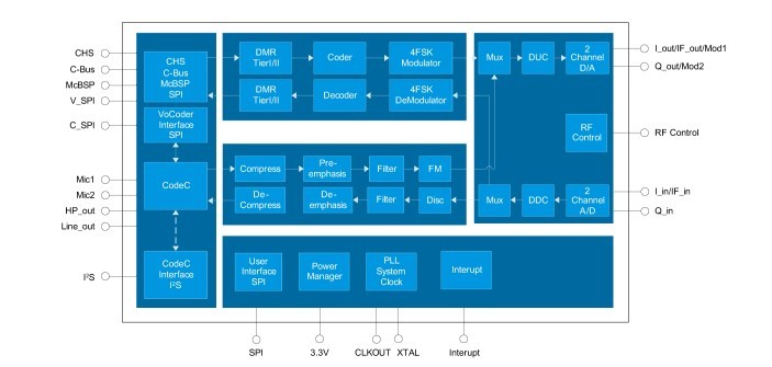 集群終端專用芯片,兼容數(shù)字、模擬對講應用,內(nèi)置高性能的4FSK調(diào)制解調(diào)器、信道編解碼和標準協(xié)議處理器,具有高性能、高集成、低功耗特性;射頻接口豐富,支持多種模擬射頻通道,兼容原有模擬對講機射頻通道;無縫對接多種聲碼器;芯片集成符合DMR Tier I/II標準完整協(xié)議棧,采用物理層、數(shù)據(jù)鏈路層和呼叫控制層三層開放設計,用戶可利用芯片二層協(xié)議接口進行PDT協(xié)議或自定義協(xié)議的開發(fā),滿足高端應用需求;適用于數(shù)字對講終端、專用集群終端以及低速數(shù)據(jù)、話音傳輸終端應用,支持中繼和無中心方式下的終端應用。