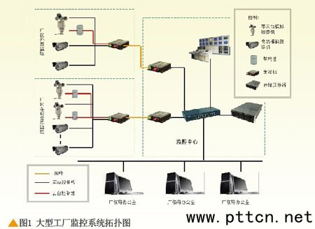 ![]() 圖1為一大型工廠監(jiān)控系統(tǒng)拓?fù)鋱D,它分為廠區(qū)外圍監(jiān)控與廠區(qū)內(nèi)部車間以及倉(cāng)庫(kù)監(jiān)控。因廠區(qū)較大,如果采用同軸電纜或者雙絞線傳輸則可能都達(dá)不到傳輸?shù)木嚯x,故只能采用光纖傳輸。因?yàn)閮H供企業(yè)內(nèi)部實(shí)時(shí)監(jiān)控與觀看,故其不需要采購(gòu)價(jià)格較高的網(wǎng)絡(luò)攝像機(jī),只需用模擬攝像機(jī)即可,所以采用科地公司推出的Voptix系列數(shù)字視頻光端機(jī)就能很好地滿足此類要求,該系列1/2/4/8路視頻數(shù)字光端機(jī)分別有非網(wǎng)管型和網(wǎng)管型兩類產(chǎn)品。其中,對(duì)于非網(wǎng)管型光端機(jī),發(fā)射機(jī)和接收機(jī)都為小型化設(shè)計(jì),既可以獨(dú)立安裝,又可以在19英寸3U機(jī)架內(nèi)密集安裝和集中供電,并針對(duì)安防監(jiān)控市場(chǎng)量身定做的一款小型化1~8路視頻、音頻、數(shù)據(jù)、以太網(wǎng)等多業(yè)務(wù)信號(hào)光纖傳輸產(chǎn)品,具有性價(jià)比高、環(huán)境適應(yīng)性強(qiáng)、工作穩(wěn)定、安裝方便的特點(diǎn)。