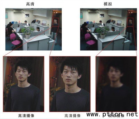 可以看出,高清入門機(jī)型200萬像素的攝像機(jī),像素即相當(dāng)于4CIF標(biāo)清機(jī)的5倍,一臺相當(dāng)于5臺。而500萬像素的高清機(jī)更是相當(dāng)于十多臺4CIF標(biāo)清攝像機(jī)。 實(shí)際圖象上的對比