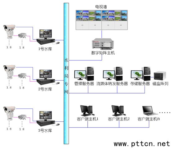 主頁(http://www.130131.com):水利系統(tǒng)網(wǎng)絡(luò)視頻防范系統(tǒng)進(jìn)行集中監(jiān)控 一、前言 視頻監(jiān)控系統(tǒng)是安全防范技術(shù)體系中的一個重要組成部分,是一種先進(jìn)的、防范能力極強(qiáng)的綜合系統(tǒng),它可以通過攝像機(jī)及其輔助設(shè)備(鏡頭等)直接觀看被監(jiān)視場所的情況,一目了然,同時它可以把被監(jiān)視場所的圖像全部或部分的記錄下來,這樣就為日后對某些事件的處理提供了方便條件及重要依據(jù),同時電視監(jiān)控系統(tǒng)還可以與防盜報(bào)警等其他安全技術(shù)防范體系聯(lián)動運(yùn)行,使防范能力更加強(qiáng)大,能及時發(fā)現(xiàn)事故和事件的隱患,預(yù)防破壞和避免造成不好影響 。 二、項(xiàng)目概述 隨著國民經(jīng)濟(jì)的迅猛發(fā)展,水利工程在國民經(jīng)濟(jì)中所起的作用越來越大,防汛更是直接影響國民經(jīng)濟(jì)發(fā)展的一個重要方面。防汛大壩集中監(jiān)控系統(tǒng),真正體現(xiàn)防汛的現(xiàn)代化管理,智能化操作。預(yù)警防汛大壩水位情況,為領(lǐng)導(dǎo)決策和減少洪水帶來損失爭取了寶貴的時間,有效保障人民生命財(cái)產(chǎn)的安全。 本項(xiàng)目是針對三個水庫及相對應(yīng)的河道,閘門的視頻監(jiān)控系統(tǒng),主要監(jiān)控水庫蓄水水位情況,大壩的安全情況,水庫周邊的環(huán)境及輔助設(shè)施情況,閘機(jī)的開合情況,以及河道的水流、水面清潔情況等,所有的這些視頻圖像都需要傳輸?shù)礁鱾水庫監(jiān)測站的監(jiān)控室,由專門的值班人員進(jìn)行監(jiān)視,發(fā)現(xiàn)問題,及時處理或上報(bào);在監(jiān)視的同時,還需要所有的視頻資料實(shí)時存儲,并且保存不低于一個月的錄像資料,此外硬盤錄像機(jī)還需要支持網(wǎng)絡(luò)功能,可以通過網(wǎng)絡(luò)將所有的視頻上傳到水利局網(wǎng)絡(luò)監(jiān)控中心,以便監(jiān)控中心相關(guān)部門可以隨時監(jiān)看各個水庫的各個圖像,或者隨時調(diào)閱各個水庫監(jiān)測站以前的錄像資料,在線回放或下載。 北京欣智恒公司根據(jù)以往水利項(xiàng)目和水利行業(yè)的特點(diǎn),對于水庫、河道等重要設(shè)施的監(jiān)控項(xiàng)目,往往涉及的地理范圍比較廣,監(jiān)控點(diǎn)比較分散,網(wǎng)絡(luò)監(jiān)控用戶又比較多,各個水利部門需要層層監(jiān)管,而且對于大規(guī)模的監(jiān)控項(xiàng)目對系統(tǒng)穩(wěn)定性的要求比較高,需要盡量減少日后的設(shè)備維護(hù)工作,為此,我公司專門針對此項(xiàng)水利設(shè)施監(jiān)控項(xiàng)目設(shè)計(jì)了一套基于Kingvee(凱威)系列產(chǎn)品的遠(yuǎn)程網(wǎng)絡(luò)視頻監(jiān)控方案。 三、系統(tǒng)拓?fù)鋱D