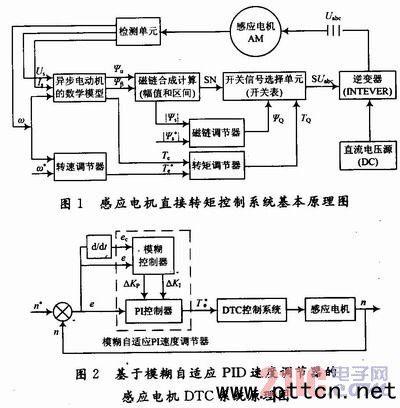 主頁(http://www.130131.com):基于模糊控制的感應(yīng)電機(jī)直接轉(zhuǎn)矩控制系統(tǒng) 根據(jù)直接轉(zhuǎn)矩控制理論,在Matlab 6.5/Simulink下構(gòu)造了一個(gè)感應(yīng)電機(jī)直接轉(zhuǎn)矩控制系統(tǒng)的仿真模型。為改善感應(yīng)電機(jī)系統(tǒng)的動(dòng)、靜態(tài)品質(zhì),設(shè)計(jì)了模糊自適應(yīng)PI速度調(diào)節(jié)器,根據(jù)速度偏差與偏差變化率,通過模糊推理在線調(diào)整PI參數(shù),提高系統(tǒng)的調(diào)速性能。仿真結(jié)果表明,這種模糊控制器具有比常規(guī)PID控制器更好的控制效果。 關(guān)鍵詞:模糊控制;直接轉(zhuǎn)矩控制;感應(yīng)電機(jī);速度調(diào)節(jié)器 引言 直接轉(zhuǎn)矩控制(DTC)是繼矢量控制技術(shù)之后又一先進(jìn)電機(jī)控制技術(shù),其結(jié)構(gòu)簡(jiǎn)單、對(duì)電機(jī)參數(shù)不敏感、轉(zhuǎn)矩響應(yīng)迅速而被廣泛應(yīng)用。感應(yīng)電動(dòng)機(jī)直接轉(zhuǎn)矩控制系統(tǒng)中,速度控制器大都是用PID控制器,傳統(tǒng)的PID控制技術(shù)不能有效克服因電機(jī)參數(shù)變化、負(fù)載變化和非線性因素帶來的影響,而模糊控制適應(yīng)非線性時(shí)變、滯后系統(tǒng)的控制,具有魯棒性強(qiáng)的優(yōu)點(diǎn)。在常規(guī)PID速度調(diào)節(jié)器由于參數(shù)固定而無法滿足系統(tǒng)高性能調(diào)速的要求時(shí),引入模糊控制技術(shù)構(gòu)造速度模糊控制器,設(shè)計(jì)了一種模糊自適應(yīng)PI速度調(diào)節(jié)器,根據(jù)速度偏差與偏差變化率,通過模糊推理在線調(diào)整PI參數(shù),有效地改進(jìn)了直接轉(zhuǎn)矩控制系統(tǒng)性能,達(dá)到了較好的控制效果。 1 直接轉(zhuǎn)矩控制基本原理 直接轉(zhuǎn)矩控制的核心思想是以轉(zhuǎn)矩為中心來進(jìn)行磁鏈、轉(zhuǎn)矩的綜合控制。它不需要解耦電機(jī)數(shù)學(xué)模型,而強(qiáng)調(diào)對(duì)電機(jī)轉(zhuǎn)矩進(jìn)行直接控制,即用空間矢量的分析方法,直接在定子坐標(biāo)系計(jì)算和控制交流電動(dòng)機(jī)的轉(zhuǎn)矩。直接轉(zhuǎn)矩控制的結(jié)構(gòu)原理如圖1所示,它由磁鏈估算、轉(zhuǎn)矩估算、磁鏈位置估算、開關(guān)表和調(diào)節(jié)器、逆變器等部分組成。其工作過程如下:首先由檢測(cè)單元檢測(cè)出電機(jī)定子電流和電壓值、實(shí)際轉(zhuǎn)速ω,然后輸入到感應(yīng)電機(jī)數(shù)學(xué)模型模塊計(jì)算出ψα,ψβ和實(shí)際轉(zhuǎn)矩值Te。ψα和ψβ通過磁鏈計(jì)算單元,得到定子磁鏈ψs的幅值|ψs|和所在區(qū)間信號(hào)SN。實(shí)際轉(zhuǎn)速ω和給定轉(zhuǎn)速ω*通過轉(zhuǎn)速調(diào)節(jié)器得到轉(zhuǎn)矩給定值。實(shí)際轉(zhuǎn)矩Te與轉(zhuǎn)矩給定值經(jīng)轉(zhuǎn)矩調(diào)節(jié)器處理后得到轉(zhuǎn)矩開關(guān)信號(hào)TQ。磁鏈給定值與磁鏈反饋值|ψs|經(jīng)磁鏈調(diào)節(jié)器處理后產(chǎn)生磁鏈開關(guān)信號(hào)ψQ。開關(guān)信號(hào)選擇單元綜合ψQ,TQ和SN,通過查表的方式得到逆變器開關(guān)信號(hào)SUabc來控制逆變器提供合適的電壓驅(qū)動(dòng)感應(yīng)電機(jī)運(yùn)行。