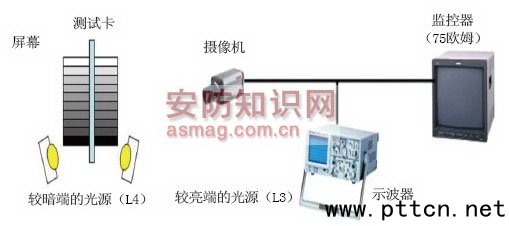 主頁(http://www.130131.com):監(jiān)控攝像機動態(tài)范圍的幾種測試方法(2) 動態(tài)范圍 = Usat /UNp-p (1) (1)式中,Usat為輸出飽和電壓;UNP-P為噪聲的峰-峰值。 顯然,動態(tài)范圍也可這樣來定義和計算,即由CCD勢阱中可存貯的最大電荷量和噪聲所決定的電荷量之比;其數(shù)值也是輸出端的信號峰值電壓與均方根噪聲電壓之比(通常用dB表示),即 動態(tài)范圍 = USp-p /UNp-p (2)式(2)USp-p為輸出信號峰值電壓。 因此,寬動態(tài)就是場景中特別亮的部位和特別暗的部位同時都能看得特別清楚,寬動態(tài)范圍就是圖像能分辨最亮的亮度信號值與能分辨的最暗的亮光信號值的比值。 顯然,確定攝像機成像器的動態(tài)范圍的方法主要有兩種:一種是使用傳感器和圖像處理器中基本電路的相關(guān)信息由上述公式計算得出;另一種是使用灰階測試卡和實驗儀器來收集和觀察圖像,并測量影像級別的方法得出。盡管采用計算的方法可在理論上算出動態(tài)范圍的極限值,但通常人們還是傾向于使用測量的方法,因為它能反映用戶對攝像機成像效果的實際體驗。下面就具體介紹國外三大廠家對攝像機動態(tài)范圍的實際測試方法。 JVC的動態(tài)范圍測試方法 對攝像機動態(tài)范圍的測試方法可能不盡相同,但其測試原理大同小異,這里介紹JVC的一種基本測試方法如下: 測試攝像機動態(tài)范圍所需的設(shè)備及條件 測試攝像機動態(tài)范圍所需要的設(shè)備如下5點: · 透射灰度卡與反射灰度卡; · 亮度可調(diào)的背光燈箱與亮度可調(diào)的照射光源; · 視頻監(jiān)視器與波形監(jiān)視器; · 測光表或照度計; · 標(biāo)準(zhǔn)內(nèi)鏡頭等。 測試攝像機動態(tài)范圍的條件:需要在暗室內(nèi)進行。 測試攝像機動態(tài)范圍的基本方法與步驟 · 第一步:在暗室中一桌子的同一垂直平面上安裝2套雙階灰度測試卡,其中1套透射灰度卡采用亮度可調(diào)的背光光源作為恒定參照,調(diào)整背光源亮度,確保自正面中心確認白塊表面的發(fā)散照度為2500Lx;另外1套反射灰度卡采用位于其正面的亮度可調(diào)的照射光源,以用于測定動態(tài)范圍的臨界值; ·第二步:架設(shè)待測攝像機與灰度測試卡中心同水平面高度,并保持與灰度測試卡垂直平面呈90°夾角,同時使攝像機鏡頭視角能涵蓋2套灰度測試卡; ·第三步:將攝像機的輸出信號連接到視頻監(jiān)視器與波形監(jiān)視器; ·第四步:在攝像機加電穩(wěn)定后,開啟擴展動態(tài)范圍功能,將正面的照射光源的亮度調(diào)整到2500Lx。顯然,在這種照度下是曝光過度的(出廠的標(biāo)準(zhǔn)照度多為2000Lx),此時反射灰度卡的白色端條紋可能會出現(xiàn)層次混合,即有2條或更多灰度條表現(xiàn)出相同的白色,而分辨不出亮度的差別; · 第五步:再不斷緩慢降低光源亮度,并不斷從波形監(jiān)視器上觀察與記錄反射灰度測試卡波形的頂電平。當(dāng)頂電平因為光源照度降低而開始相應(yīng)降低時,記錄此時的照度值(如L1),這一照度值即為該攝像機動態(tài)范圍的上限。此時的攝像機應(yīng)當(dāng)正好可以表現(xiàn)出亮度較大的白色條紋之間的亮度層次區(qū)別; · 第六步:然后再不斷繼續(xù)緩慢降低亮度,并不斷從波形監(jiān)視器上觀察與記錄反射灰度測試卡波形的頂電平。當(dāng)頂電平不再因為光源照度降低而繼續(xù)相應(yīng)降低時,記錄此時的照度值(如L2),這一照度值即為該攝像機動態(tài)范圍的下限。此時攝像機拍攝的灰度卡圖像中在亮度暗的2個灰黑色條紋之間的亮度層次區(qū)別應(yīng)當(dāng)正好消失而混合成一塊黑色。 測試結(jié)果計算 用上述實際測試方法計算動態(tài)范圍的公式如下: 動態(tài)范圍=20logL1/L2 (dB) (3)用上述測試方法測得JVC的CCD寬動態(tài)攝像機TK-WD310EC的頂電平變化自2200Lx開始至1.1Lx結(jié)束,由式(2)可得 動態(tài)范圍=20log2200/1.1=66dB 用上述測試方法測得某公司的CCD寬動態(tài)攝像機的頂電平變化自1500Lx開始至5Lx結(jié)束的動態(tài)范圍為 動態(tài)范圍=20log1500/5=49dB JEITA的動態(tài)范圍測試方法 JEITA是日本電子資訊技術(shù)產(chǎn)業(yè)協(xié)會的簡稱,其對攝像機動態(tài)范圍的測量方法也是采用灰階測試卡。實際上,是否能夠準(zhǔn)確確定動態(tài)范圍,一個重要的限制因素是灰階測試卡是否能夠有效測出動態(tài)范圍的全部取值。比如 Kodak Q-14 測試卡,相鄰灰階格的刻度差是1/3光圈級數(shù) (f-stop),最多只能測量出5.66檔或大約34分貝的動態(tài)范圍。 使用 JEITA 方法測量動態(tài)范圍和動態(tài)范圍擴展比率時,灰階測試卡的 gamma值指定為2.2,總共有十個灰階級別,能夠測出的動態(tài)范圍與Q-14灰階測試卡基本相同。按照這種方法的規(guī)格說明書所述,將兩張灰階測試卡并排放置,二者中間以屏幕相隔。再用兩臺不同的照明光源分別照射屏幕兩側(cè)的測試卡,如圖2所示。 圖2 JEITA 動態(tài)范圍擴展比率測量裝置 JEITA 方法中規(guī)定,對測試卡較亮的一端不斷增加照明強度或增大光圈,直到剛好可以區(qū)分出最亮的兩個灰階級別,然后對測試卡較暗的一端不斷減小照明強度直到最亮的灰階級別(白色)達到 50 IRE。用前述測試法中的公式(3)即可計算動態(tài)范圍的擴展比率(dB),即 動態(tài)范圍擴展比率(dB)=20log(L3/L4) 這種方法雖然算出了動態(tài)范圍擴展值,但它