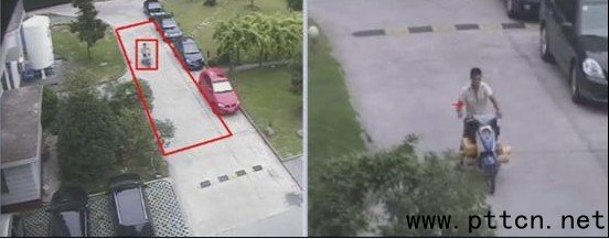 5)徘徊 在攝像機(jī)監(jiān)視的場(chǎng)景范圍內(nèi),根據(jù)監(jiān)控需要和目的設(shè)置警戒區(qū)域,系統(tǒng)可以自動(dòng)檢測(cè)入侵到警戒區(qū)域內(nèi)的運(yùn)動(dòng)目標(biāo)及其行為,一旦發(fā)現(xiàn)有目標(biāo)在警戒區(qū)域徘徊時(shí)間超過設(shè)定好的時(shí)間時(shí),則自動(dòng)產(chǎn)生報(bào)警信息。該功能主要用于自助銀行周圍的周界防范。 ![]() 6)雙攝像機(jī)跟蹤 在視頻監(jiān)控系統(tǒng)中,監(jiān)控區(qū)域的大小和目標(biāo)的細(xì)節(jié)是一個(gè)矛盾。如果攝像機(jī)的監(jiān)控區(qū)域大,則難以得到目標(biāo)的細(xì)節(jié);如果想要得到目標(biāo)的細(xì)節(jié),則攝像機(jī)的監(jiān)控區(qū)域會(huì)很狹窄。 L/F雙攝像機(jī)機(jī)跟蹤系統(tǒng)是解決上述問題的一個(gè)有效方案。該系統(tǒng)由兩個(gè)攝像機(jī)配合組成,一臺(tái)靜止攝像機(jī)作為主攝像機(jī)(Leader),對(duì)銀行外圍大區(qū)域范圍進(jìn)行監(jiān)控,一臺(tái)高速球機(jī)作為從攝像機(jī)(follower),跟蹤放大目標(biāo)的細(xì)節(jié)。當(dāng)主攝像機(jī)檢測(cè)到有可疑情況發(fā)生的時(shí)候,如跨越警戒面、進(jìn)入/離開警戒區(qū)域、徘徊等,主攝像機(jī)發(fā)送指令控制從攝像機(jī)進(jìn)行云臺(tái)旋轉(zhuǎn)和鏡頭縮放,鎖定觸發(fā)報(bào)警的目標(biāo)并對(duì)其進(jìn)行自動(dòng)跟蹤,使目標(biāo)持續(xù)放大以顯示在畫面中央,這樣可以看到更清晰的目標(biāo)特征,以利于實(shí)時(shí)的判斷和事后對(duì)照取證。 下圖顯示了雙攝像機(jī)跟蹤的效果:靜態(tài)攝像機(jī)(左)視野開闊,能監(jiān)控較大范圍的區(qū)域,但對(duì)其中的目標(biāo)卻很難得到細(xì)節(jié),而配合上球機(jī)(右)后,球機(jī)根據(jù)靜態(tài)攝像頭提供的信息,自動(dòng)鎖定并跟蹤目標(biāo),使目標(biāo)以一定的放大倍數(shù)處于視野中心,得到有關(guān)目標(biāo)豐富的信息。該功能可以用于室外ATM機(jī)取款人員的跟蹤,為獲取取款人員清晰的特征提供依據(jù)。
