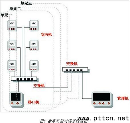 數(shù)字可視對講技術(shù)原理及框圖 數(shù)字可視對講系統(tǒng)的構(gòu)成,一般包含這么幾個模塊:室內(nèi)機(jī),梯口機(jī)、交換機(jī)、管理機(jī)等。如圖2所示。