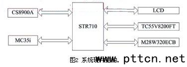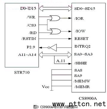 2 主芯片STR710 STR710是整個(gè)系統(tǒng)的核心。它作為一個(gè)嵌入式網(wǎng)關(guān),將外部網(wǎng)絡(luò)與所有的網(wǎng)絡(luò)家電連接在一起,是整個(gè)系統(tǒng)運(yùn)行的平臺(tái)。首先,在遠(yuǎn)程操縱家電方面,STR710負(fù)責(zé)從MC35i接收到的短消息和CS8900A接收到的以太網(wǎng)數(shù)據(jù)中提取出用戶指令,然后根據(jù)該指令操縱相應(yīng)的網(wǎng)絡(luò)家電或者查詢其運(yùn)行情況,最后將執(zhí)行結(jié)果反饋到用戶終端。其次,在網(wǎng)絡(luò)家電工作模式設(shè)置方面,STR710的任務(wù)主要是在LCD上顯示相應(yīng)的菜單以及幫助信息,通過(guò)良好的界面指導(dǎo)用戶完成設(shè)置。STR710還定時(shí)查看家用電器的工作情況。一旦出現(xiàn)緊急或危險(xiǎn)的狀況時(shí),及時(shí)采取必要的保護(hù)措施,并向用戶終端報(bào)警。 3 網(wǎng)絡(luò)控制器CS8900A S8900A支持I/O傳輸模式、Memory模式和DMA模式,其中,I/O模式是訪問(wèn)CS8900A存儲(chǔ)區(qū)的默認(rèn)模式,比較簡(jiǎn)單易用,所以在本系統(tǒng)中選用I/O模式。CS8900A與STR710的硬件連接框圖如圖3所示,STR710通過(guò)/SBHE、/IOW和/IOR等控制信號(hào)實(shí)現(xiàn)對(duì)CS8900A的工作方式控制和讀寫操作。數(shù)據(jù)的接收采用中斷方式,由于CS8900A和STR710的中斷電平是相反的,所以,中斷信號(hào)線間需接一個(gè)非門。CS8900A與STR710之間的數(shù)據(jù)傳輸采用的是默認(rèn)的I/O模式,因此,讀寫引腳/MEMW和/M EMR被置高,以關(guān)閉Memory方式。在此模式下,用4根地址線就可以實(shí)現(xiàn)對(duì)所有寄存器的訪問(wèn)。如圖3所示,引腳SA0~SA3對(duì)應(yīng)接到STR710的地址線A11~A14上即可。除了為保證上述的默認(rèn)偏移地址(0x0300),須將SA8和SA9置高外,其余不用的地址線都接低電平。 CS8900A通過(guò)一個(gè)帶厄流線圈的隔離變壓器(E2023)將CPU要發(fā)送的數(shù)據(jù)發(fā)送到網(wǎng)絡(luò)上;接收數(shù)據(jù)時(shí),由網(wǎng)絡(luò)傳來(lái)的數(shù)據(jù)也經(jīng)過(guò)隔離變壓器。加隔離變壓器的作用主要是將外部線路與CS8900A隔開(kāi),防止干擾和燒壞元器件,實(shí)現(xiàn)帶電的插拔功能。