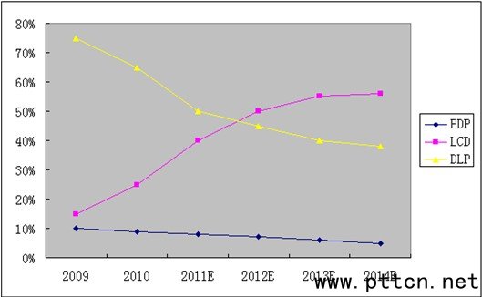 大屏拼接幕產(chǎn)品銷售量占比未來趨勢預測 從上圖我們可以清晰看到,未來在液晶拼接產(chǎn)品拼縫技術(shù)不斷的發(fā)展突破下,銷售規(guī)模將有望在3-5年內(nèi)保持30%以上的平均增長速度向前增長,且總體拼接市場的比重將于2013年突破50%。整體大屏拼接市場中,PDP等離子拼接將逐步減弱,未來的增長很小。而DLP背投拼接屏也將在2年后受到液晶拼接屏的沖擊,銷售規(guī)模占比降到50%以內(nèi),不過3-5年內(nèi)液晶拼接核心優(yōu)勢主要是在信息發(fā)布領(lǐng)域,在控制室領(lǐng)域DLP還是能保持與LCD液晶拼接雙雄格局。數(shù)據(jù)來源奧維AVC大屏拼接市場研究報告。 目前在大屏拼接領(lǐng)域,DLP、PDP與LCD分別有各自優(yōu)勢,占據(jù)了不等的市場份額,呈現(xiàn)出三分天下的局勢。雖然DLP顯示器作為大屏拼接領(lǐng)域的開拓者,但是,由于DLP顯示器的色彩與亮度不均勻、產(chǎn)品功耗過大、占用空間多等問題一直未有效的突破,DLP技術(shù)正面臨著強烈沖擊。PDP等離子產(chǎn)品雖然在畫質(zhì)上取得了一定的進展,但是短板灼屏以及壽命的先天不足等問題,在很大程度上制約了PDP產(chǎn)品的發(fā)展與普及。而只有LCD液晶拼接產(chǎn)品的出現(xiàn),令大屏拼接市場格局發(fā)生了巨大的變化。它以具有高清晰度、寬可視角度、高亮度、長壽命等優(yōu)點,迅速的被市場和用戶認可與接受。 未來大屏幕拼接市場,LCD液晶拼接是有可能作為產(chǎn)業(yè)王者,在激烈的競爭中脫穎而出的。近幾年來,LCD液晶拼接產(chǎn)品發(fā)展火爆,占據(jù)了多達五分之一的市場份額。當然由于液晶拼接產(chǎn)品在拼接過程中無法避免的拼接縫隙,導致了在普及和應用高端行業(yè)過程中遭遇到了難以突破的瓶頸。但是我們有理由相信當液晶拼接在解決無縫問題后,大屏顯示領(lǐng)域?qū)孢M入到液晶的時代。 (中國集群通信網(wǎng) | 責任編輯:陳曉亮) |