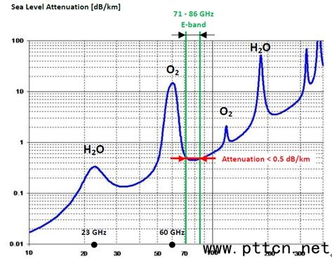 圖2. ETSI和FCC定義的E-Band射頻波道配置 E-Band微波傳輸距離 微波傳輸?shù)木嚯x同時受到自由空間損耗、大氣損耗和雨衰的影響,接下來我們重點分析下E-Band微波的傳輸性能: 自由空間損耗: 71GHz~76GHz的自由空間路徑損耗大約是130dB,81GHz~86GHz的自由空間損耗是131dB。這個值普遍高于傳統(tǒng)頻段下的自由空間損耗,這就直接造成E-Band的傳輸距離要遠小于其它傳統(tǒng)頻段。 大氣損耗: 在下面的大氣窗口圖中可以看到,在71GHz~86GHz這個范圍內(nèi),大氣對E-Band的衰耗是很低的,基本小于0.5dB/km。