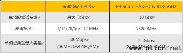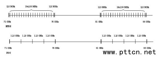 圖1. E-Band射頻定義 同時,業(yè)界標準機構ITU-R、FCC、CEPT分別對E-Band的射頻波道配置做了相關的建議,信道劃分以250MHz和1.25GHz為主。 正是有了250MHz甚至更大的波道間隔資源,E-BAND微波單頻點能提供更大的帶寬,目前業(yè)界最大單頻點帶寬達2.5Gbps,未來甚至能提供10G的空口傳輸帶寬。