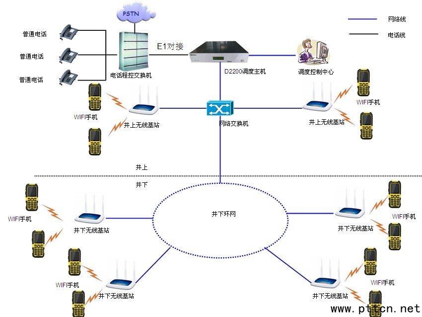 藍海迅捷礦山井下無線通信系統(tǒng)一體化礦用調(diào)度機作為核心通信調(diào)度平臺,以WiFi基站作井下巷道的無線覆蓋,采用VoIP的語音處理技術(shù),實現(xiàn)礦井的通信聯(lián)絡(luò)功能,可以滿足日常通信聯(lián)絡(luò)與搶險救援雙重任務(wù),井上調(diào)度員能隨時與井下的任何一部WIFI無線手機建立聯(lián)系。