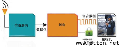 圖3 DMR只用一套設(shè)備實(shí)現(xiàn)信號中繼 六、DMR中,電池的壽命能提高多少? 因?yàn)橐粋(gè)時(shí)間內(nèi)只有一個(gè)時(shí)隙在使用,不像FDMA中電池一直處于使用狀態(tài),所以DMR中電池的壽命可增加40%. 七、DMR實(shí)現(xiàn)了保密通信嗎? 只有身份碼相同的機(jī)器才能通信,排除了竊聽的任何可能。詳見圖4、5.