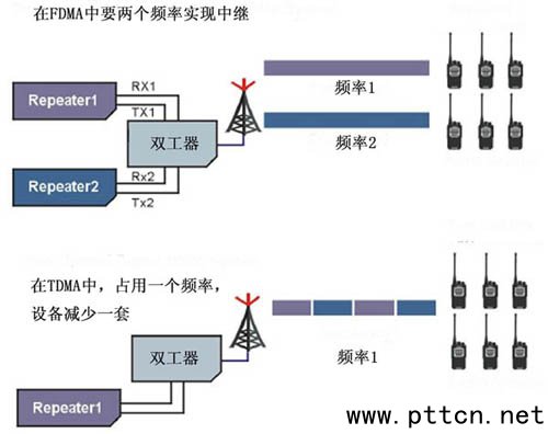 圖2 DMR通信時(shí)音質(zhì)與距離的改善圖 在大范圍內(nèi)語音清晰; 通信距離增加; 抗干擾能力增強(qiáng)。 五、用DMR為什么能降低成本? DMR中采取TDMA接入方式,在中繼時(shí)只需一個(gè)頻率點(diǎn),而在FDMA中實(shí)現(xiàn)中繼,通常要用兩不同的頻率,從而增加了一套設(shè)備的造價(jià),從圖3可清楚看出。