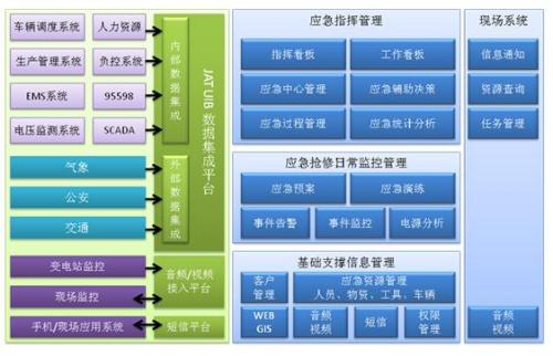 ![]() 圖表 3總體功能架構(gòu)圖 重點(diǎn)模塊功能簡介: * 應(yīng)急中心管理:應(yīng)急啟動(dòng)、籌備指揮、搶修隊(duì)伍組織,對內(nèi)外信息發(fā)布。 * 指揮過程管理:對于嚴(yán)重預(yù)警信息、重要作業(yè)、突發(fā)故障及保供電工作時(shí),應(yīng)急指揮任務(wù)管理,實(shí)現(xiàn)應(yīng)急工作流程化、任務(wù)閉環(huán)化、指揮扁平化全。 * 指揮工作看板:發(fā)布重要信息、規(guī)章制度、新聞、天氣信息;通過集成整合調(diào)度實(shí)時(shí)信息、客服搶修信息、場站的現(xiàn)場視頻、氣象信息、重要客戶信息,進(jìn)行日常重點(diǎn)監(jiān)測。 * 應(yīng)急資源管理:對應(yīng)急保障體系中的專家、搶修隊(duì)伍、車輛、物資進(jìn)行管理。 * 應(yīng)急預(yù)警:每天對監(jiān)測信息進(jìn)行挖掘、分析,針對電網(wǎng)過載、超載、缺陷等信息,生成不同級別的預(yù)警信息。 * 信息查詢與搶修分析:搶修日報(bào)歷史數(shù)據(jù)查詢、查詢分析、多維分析、指揮看板(到崗信息、故障統(tǒng)計(jì)、搶修看板)