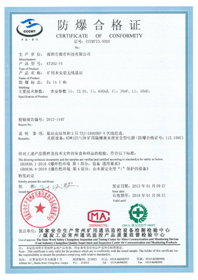 主頁(yè)(http://www.130131.com):開(kāi)歲報(bào)喜,震有科技礦用本安型無(wú)線基站、無(wú)線攝像儀獲防爆合格證 近日,震有科技順利取得KT202-F1礦用本安型無(wú)線基站、KBA12W礦用本安型無(wú)線攝像儀順利通過(guò)防爆實(shí)驗(yàn),得由國(guó)家安全生產(chǎn)常州礦用通訊監(jiān)控設(shè)備檢測(cè)檢驗(yàn)中心頒發(fā)的防爆合格證。 到目前為止,震有科技礦用無(wú)線通信系統(tǒng)、礦用本安型無(wú)線基站、礦用本安型手機(jī),礦用本安型無(wú)線攝像機(jī)等幾大礦用通信設(shè)備都取得了煤礦安全領(lǐng)域的通行證,為公司大力拓展煤礦能源市場(chǎng)奠定了堅(jiān)實(shí)有力的基礎(chǔ)。