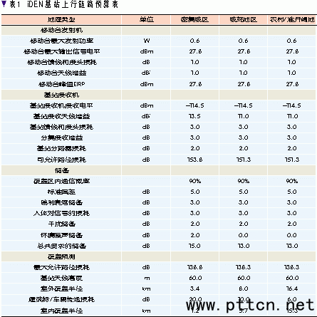 經(jīng)過(guò)核算,iDEN系統(tǒng)的覆蓋通常受限于上行鏈路,表1為國(guó)脈iDEN系統(tǒng)基站的上行鏈路預(yù)算和覆蓋預(yù)測(cè)的結(jié)果。
