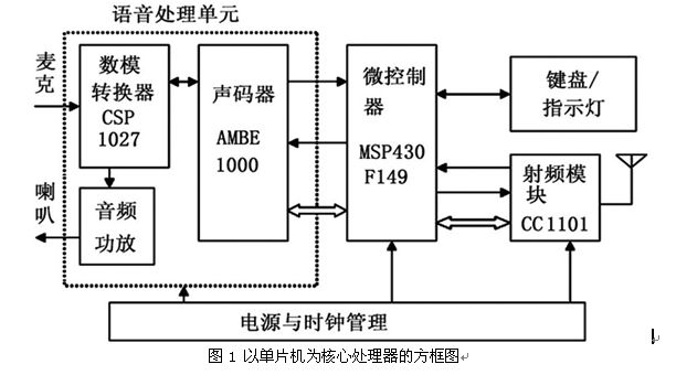主頁(http://www.130131.com):數(shù)字對講機(jī)主流方案探索(一) 方案一 以單片機(jī)為核心處理器的DMR對講機(jī)方案(MSP430F149+AMBE1000) ●工作原理 發(fā)射時(shí),由麥克送來的模擬語音經(jīng)CSP1027進(jìn)行A/D轉(zhuǎn)換,由聲碼器AMBE1000進(jìn)行語音壓縮,交單片機(jī)MSP430F149進(jìn)行協(xié)議填充組幀,送到CC1101進(jìn)行調(diào)制后發(fā)射。接收時(shí),由CC1101解調(diào)出來的碼流經(jīng)MSP430F149進(jìn)行幀恢復(fù),交由聲碼器進(jìn)行解壓,數(shù)據(jù)經(jīng)CSP1027進(jìn)行D/A轉(zhuǎn)換為模擬語音信號。 ●關(guān)鍵器件 微控制器采用TI公司的MSP430F149,它是16位超低功耗、混合信號微控制器,采用“馮·諾依曼”結(jié)構(gòu),可用JTAG(一種標(biāo)準(zhǔn)測試接口)進(jìn)行仿真調(diào)試。 芯片的電源電壓為(1.8~3.6)V,在RAM數(shù)據(jù)保持方式下耗電僅0.1uA,活動模式耗電250 uA/MIPS(每秒百萬條指令數(shù))。運(yùn)算時(shí)由于本單片機(jī)采用16位RISC(精簡指令集計(jì)算機(jī)),一個(gè)時(shí)鐘周期可以執(zhí)行一條指令,而傳統(tǒng)的單片機(jī)要12個(gè)時(shí)鐘周期才執(zhí)行一條指令。工作在8MHz的晶振頻率時(shí),指令速度可達(dá)8MIPS,而同樣這個(gè)指令速度,16位處理器比8位處理器高遠(yuǎn)不止兩倍。 ●方案點(diǎn)評 聲碼器AMBE1000在國內(nèi)已有產(chǎn)品,價(jià)格比較合理。CC1101的靈敏度為-116dBm(1.2kbps,1%數(shù)據(jù)包誤碼率,工作在433MHz時(shí)),與國內(nèi)的對講機(jī)可用靈敏度-120dBm相比偏低,但符合歐盟的CE標(biāo)準(zhǔn)規(guī)定小于-107dBm.另外,射頻模塊的功率輸出僅12dBm(16mW),所以本方案僅適用短距離范圍的通信。提高靈敏度可考慮用器件ADF7021作為射頻模塊。 圖1 以單片機(jī)為核心處理器的方框圖