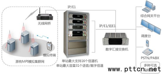 在規(guī)劃建設(shè)區(qū)域,拆除原有模擬基站,直接新建PDT數(shù)字系統(tǒng),同時(shí)可以將拆除的原有模擬基站搬遷到二線地區(qū)使用,保護(hù)原有基站設(shè)備的投資。新建的PDT數(shù)字集群網(wǎng)絡(luò)和遺留的模擬集群網(wǎng)絡(luò)通過(guò)標(biāo)準(zhǔn)的PDT-MPT無(wú)線網(wǎng)關(guān)設(shè)備互聯(lián)互通。