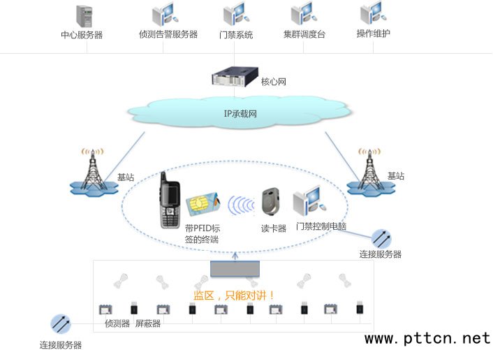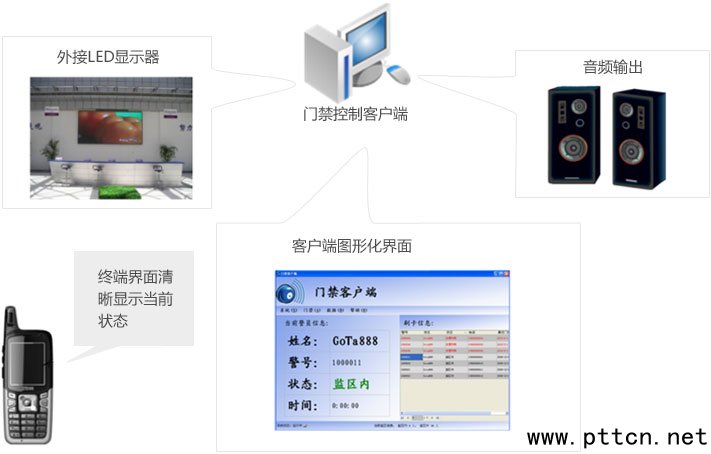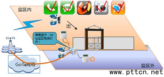 采用監(jiān)管區(qū)的無線信號屏蔽方案限制語音功能,投資成本高,實施難度大。如果監(jiān)獄在市區(qū)附近,還影響監(jiān)獄周邊用戶使用語音功能。GoTa系統(tǒng)可以通過無線,遠程對GoTa終端進行精確控制,如控制終端普通語音、短信、數(shù)據(jù)業(yè)務(wù)、攝像頭等的開啟和關(guān)閉。該功能和門禁系統(tǒng)融合,用于在某一特殊區(qū)域控制終端可用的功能,比如在監(jiān)管區(qū)中,需要將獄警終端的語音、短信、數(shù)據(jù)等業(yè)務(wù)全部關(guān)閉,只留下集群業(yè)務(wù)。