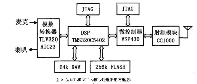 主頁(http://www.130131.com):數(shù)字對(duì)講機(jī)主流方案探索(二) 方案二 以DSP+MCU為核心處理器的對(duì)講機(jī)方案 ●工作原理 方案以MSP430為中心系統(tǒng)來完成數(shù)據(jù)的收、發(fā)控制等工作,系統(tǒng)采用MSP430中 USART模塊的SPI同步通信模式。在接收過程中,首先接收來自射頻芯片的FSK數(shù)據(jù),解調(diào)后由MSP430將數(shù)據(jù)幀的同步域、尾域、ID域以及命令字節(jié)去除后,數(shù)據(jù)發(fā)至C5402進(jìn)行去壓縮處理,數(shù)據(jù)交AIC23進(jìn)行D/A轉(zhuǎn)換為語音信號(hào)。在發(fā)送過程中,首先由AIC23進(jìn)行A/D轉(zhuǎn)換,數(shù)據(jù)交C5402將語音壓縮,再由微控制器MSP430進(jìn)行協(xié)議填充,加上頭域、尾域、ID域以及命令字節(jié)形成數(shù)據(jù)幀,然后控制射頻模塊將數(shù)據(jù)發(fā)送。 ●關(guān)鍵器件 TMS320C5402是TI公司于1996年推出的一種定點(diǎn)DSP芯片,采用先進(jìn)的修正哈佛結(jié)構(gòu)和8總線結(jié)構(gòu),使處理器的性能大大提高。其獨(dú)立的程序和數(shù)據(jù)總線允許同時(shí)訪問程序存儲(chǔ)器和數(shù)據(jù)存儲(chǔ)器,實(shí)現(xiàn)高速并行操作。如,可以在一條指令中同時(shí)執(zhí)行3次讀操作和1次寫操作。TMS320C5402的運(yùn)行速度為40MIPS,指令周期為25ns.此外,還可以在數(shù)據(jù)總線與程序總線之間相互傳送數(shù)據(jù)。從而使處理器具有單個(gè)周期內(nèi)同時(shí)執(zhí)行算術(shù)運(yùn)算、邏輯運(yùn)算、位移操作、乘法累加運(yùn)算以及訪問程序、數(shù)據(jù)存儲(chǔ)等強(qiáng)大功能。 ●方案點(diǎn)評(píng) 采用DSP方案時(shí),免去選用語音芯片聲碼器的煩惱,提高了數(shù)字對(duì)講機(jī)對(duì)語音處理的能力,可讓語音編碼的算法盡量優(yōu)化,從而使對(duì)講機(jī)語音信號(hào)的處理更具通用性和擴(kuò)展性。本方案是以DSP為開發(fā)平臺(tái),經(jīng)過連續(xù)可變斜率增量(CVSD)調(diào)制編解碼得到語音信號(hào)的清晰度和自然度好,但軟件開發(fā)工作量大。CC1000不支持4FSK調(diào)制與解調(diào),本方案不適用于DMR與dPMR協(xié)議。另外CC1000的接收可用靈敏度為-110dBm,國內(nèi)對(duì)講機(jī)廠家可能嫌低。 圖2 以DSP和MCU為核心處理器的方框圖