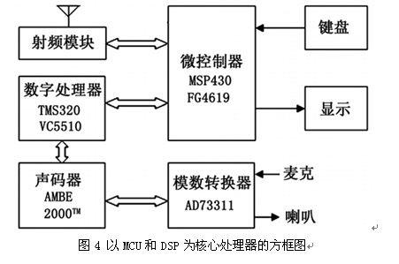 主頁(yè)(http://www.130131.com):數(shù)字對(duì)講機(jī)主流方案探索(四) 方案四 以MCU+DSP的DMR對(duì)講機(jī)方案(MSP430FG4619+VC5510) ●工作原理 發(fā)射時(shí),由麥克送來的模擬語(yǔ)音經(jīng)模數(shù)轉(zhuǎn)換器AD73311采樣成數(shù)字信號(hào),AMBE2000對(duì)語(yǔ)音數(shù)字信號(hào)進(jìn)行壓縮編碼,數(shù)字信號(hào)由VC5510進(jìn)行DMR通信協(xié)議填充組成幀信號(hào)和4FSK的調(diào)頻波成形,最后由微控制器MCU進(jìn)行D/A轉(zhuǎn)換,送往射頻模塊進(jìn)行發(fā)射調(diào)制,實(shí)現(xiàn)發(fā)射。 接收時(shí),MCU將射頻模塊送來已解調(diào)數(shù)據(jù)進(jìn)行A/D轉(zhuǎn)換,經(jīng)VC5510進(jìn)行拆幀,交AMBE2000進(jìn)行解壓,數(shù)據(jù)由AD73311數(shù)模轉(zhuǎn)換為語(yǔ)音信號(hào)。 微控制器MSP430FG4619是整個(gè)系統(tǒng)的控制中心,人機(jī)接口如鍵盤、顯示器與MCU直接連接。微控制器實(shí)現(xiàn)對(duì)射頻模塊的控制,包括基帶信號(hào)的發(fā)送與接收、射頻頻率點(diǎn)的控制、信道檢測(cè)等,MCU還負(fù)責(zé)DMR協(xié)議的高層信令控制、人機(jī)接口的互通等。 另外,請(qǐng)注意微控制器還要完成基帶信號(hào)的AD/DA轉(zhuǎn)換功能。 ●關(guān)鍵器件 AMBE2000TM聲碼器是美國(guó)語(yǔ)音公司DVSI推出的一款適應(yīng)性強(qiáng)、高性能、單芯片的語(yǔ)音壓縮編解碼器。它能在低速率下提供優(yōu)良的語(yǔ)音質(zhì)量,并實(shí)現(xiàn)了實(shí)時(shí)的、全雙工的標(biāo)準(zhǔn)設(shè)定的AMBE語(yǔ)音壓縮軟件算法。 大量的評(píng)估顯示,這款聲碼器具有在一般數(shù)據(jù)速率下提供同數(shù)字蜂窩系統(tǒng)一樣性能的能力。AMBE在2.4kbps速率下保持自然語(yǔ)音質(zhì)量和清晰度,由于AMBE算法復(fù)雜性低,所以它能夠完全集成在成本低、功耗低的芯片上。 ●方案點(diǎn)評(píng) 方案簡(jiǎn)單,實(shí)用。 軟件開發(fā)中,微控制器和數(shù)字處理器的程序?qū)MR協(xié)議的分層必須有清晰的概念,正確的程序設(shè)計(jì)是硬件實(shí)現(xiàn)的保證。聲碼器的選用有較大的余地。