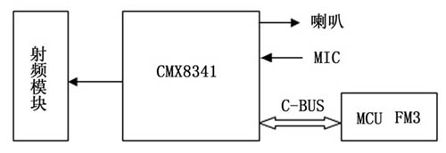 圖1 采用OMAP的數(shù)字產(chǎn)品DMRdPMR 第二種是以CML公司為代表,采用CMX8341+MCU+RF模塊的方案,如圖2,本方案將原來的CMX7141基帶處理與CMX618聲碼器兩顆套片集成進(jìn)單個芯片,使得電路一下變得簡單清晰,操作和CPU控制也變得容易。CMX8341批量價格已控制在70元左右,微控制器如采用32位Cortex-M0或M3,比如富土通的FM3或ST公司的STM32,批量價格僅15元左右,射頻模塊參考CML提供的ATB010模塊方案,成本價格約50元,按此方案整機(jī)的價格可控制在250元以下,這是目前dPMR設(shè)計中成本最低的一種方案。