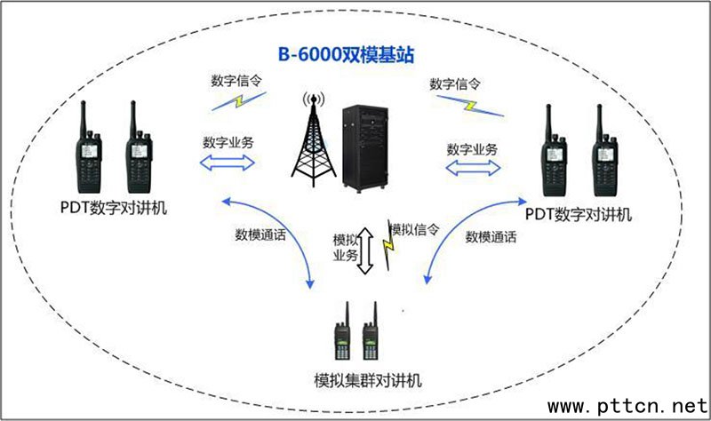 2. B-6000數(shù)字模擬兼容基站 同時(shí)提供PDT和MPT控制信令,業(yè)務(wù)信道工作模式按需動(dòng)態(tài)切換,便于PDT對(duì)講機(jī)和MPT對(duì)講機(jī)在雙;緝(nèi)相互通信,確保原有對(duì)講機(jī)在PDT數(shù)字系統(tǒng)繼續(xù)使用,保護(hù)原有投資。