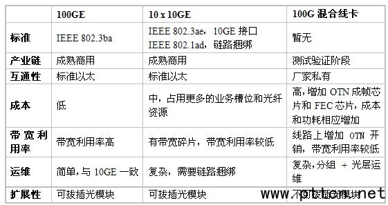 在PTN產(chǎn)品領(lǐng)域,PTN設(shè)備100G解決方案分為3種:10×10GE端口聚合、100G混合線卡和100GE。10×10GE端口聚合方式雖然能提供100GE帶寬,但是部署維護(hù)復(fù)雜,并且消耗寶貴的光纖資源;100G混合線卡本質(zhì)上是在分組設(shè)備上集成一個(gè)OTN的成幀芯片和FEC芯片,成本和功耗相應(yīng)增加;而100GE方式在產(chǎn)業(yè)鏈、運(yùn)維、成本等方面具有優(yōu)勢(shì)。 各方案優(yōu)劣對(duì)比如下圖: