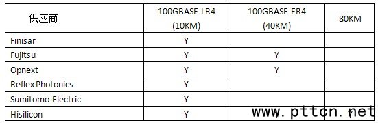 從產(chǎn)業(yè)鏈的角度來(lái)看,100GE技術(shù)已經(jīng)在路由器、波分產(chǎn)品上廣泛應(yīng)用,PTN與波分、路由器三大產(chǎn)品共享100GE產(chǎn)業(yè)鏈。從2011年開(kāi)始,F(xiàn)inisar、Fujitsu、華為Hisilicon等廠家就能提供標(biāo)準(zhǔn)化的10KM的100GE CFP模塊,并于2013年和2014年分別推出了40KM和80KM模塊。2014年,中國(guó)移動(dòng)集采測(cè)試了100GE 80KM方案,標(biāo)志著100GE長(zhǎng)距離解決方案成熟。 當(dāng)前各廠家100GE光模塊提供能力: