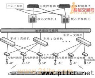 采用WLAN方式時,在隧道沿線布置無線AP設(shè)備,在車站設(shè)置交換機設(shè)備,在控制中心設(shè)置無線控制設(shè)備,列車上安裝車載天線和無線接入設(shè)備。 2.1.2 PIS車地?zé)o線網(wǎng)絡(luò)帶寬分析 根據(jù)PIS車載子系統(tǒng)的功能,要求移動的列車與地面之間具有實時數(shù)據(jù)傳輸?shù)哪芰,在列車高速運行時,應(yīng)保證圖像質(zhì)量,不會出現(xiàn)馬賽克、中斷等現(xiàn)象,無線網(wǎng)絡(luò)系統(tǒng)應(yīng)能支持快速移動通信及漫游切換。其中無線網(wǎng)絡(luò)傳輸?shù)臄?shù)據(jù)主要分為車載視頻播放信息和車載視頻監(jiān)控信息。 2.1.2.1 車載視頻播放信息 每列列車接收來自控制中心下發(fā)的1路MPEG-2編碼的標(biāo)清數(shù)字視頻信息,每路信息占用的帶寬一般為4~8MHz,加上預(yù)留10%的視頻重傳技術(shù),因此一般在4~8MHz×110%=4.4~8.8MHz。除此之外,還包括PIS系統(tǒng)的文本信息和控制信息,一般在100KHz左右。因此車載視頻播放信息所需帶寬總共大約在4.5~8.9MHz。 2.1.2.2 車載視頻監(jiān)控信息 在區(qū)間運營中的每列列車要求上傳2路MPEG-4編碼的視頻圖像信息,每路占用的帶寬約為2MHz,因此總帶寬約為2×2MHz=4MHz。 由上述分析可得,PIS系統(tǒng)在車地?zé)o線網(wǎng)絡(luò)中所需要的總帶寬至少應(yīng)該在13MHz以上。 2.2 CBTC無線技術(shù)組網(wǎng)與帶寬分析 目前國內(nèi)新建軌道交通項目中的CBTC系統(tǒng)采用的WLAN技術(shù)一般基于802.11b或802.11g標(biāo)準(zhǔn),由于信號專業(yè)的特殊性,目前能夠提供基于通信的移動閉塞的信號廠家采用的無線局域網(wǎng)標(biāo)準(zhǔn)不同,產(chǎn)品差別也較大。圖2組網(wǎng)方式是其中采用以無線AP方式接入的組網(wǎng)結(jié)構(gòu),目前在地鐵隧道中較多使用。 CBTC 無線網(wǎng)絡(luò)傳輸?shù)闹饕獢?shù)字信息有:列車目的地碼、車次號、本列車的定位信息、本列車的速度信息等。由于信息編碼長度較短,數(shù)據(jù)包長度一般不會超過1000bits,信號系統(tǒng)供貨商一般選擇40 ~100 kbps的凈傳輸速率作為其系統(tǒng)必須保證的最低傳輸速率。