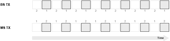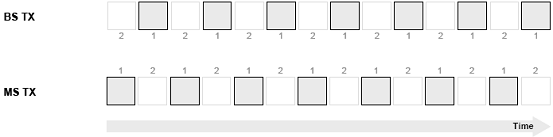 圖6 對齊信道模式 5.2 偏移模式 如圖7所示,在偏移信道模式下,邏輯信道1由下行信道(時隙)1和上行信道(時隙)1組成,占用邏輯信道1的BS在下行信道1發射和接收上行信道1的發射;MS在上行信道1發射和接收下行信道1的發射。邏輯信道2不再贅述。 可見工作在偏移模式下的BS與MS收發時隙互相錯開,因為MS收發錯開一個時隙,故雙工工作的MS可以用收發切換開關替代昂貴的雙工器。