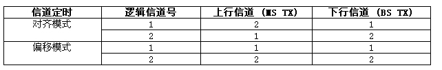 圖5 TDMA時序 因PDT上下行載波每幀分為兩個時隙,故可以提供兩對上下行信道,即兩個物理信道。 5. 對齊模式與偏移模式 語音和數據會話要求有一對上、下行信道,上、下行信道之間的定時關系既可以是對齊模式,亦可以是偏移模式。上、下行信道的邏輯關系如表1所示,由表可見一個邏輯信道包括上、下行信道,其中邏輯信道標號與下行信道的標號相同。 表1 上行和下行邏輯信道關系