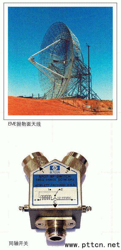 主頁(http://www.130131.com):走近EME通信實(shí)驗(yàn) 下篇 要成功地完成EME通信,必須有一定的基本器材裝備,如收發(fā)信機(jī)、天線以及附屬設(shè)備等。這些裝備的功能與整體系統(tǒng)所能發(fā)揮的能力有著密切的關(guān)系。從理論上講,發(fā)射部分重點(diǎn)是大的發(fā)射功率,對(duì)于接收機(jī)而言,高的靈敏度和低的噪聲是重點(diǎn),而天線系統(tǒng)主要是高增益低損耗等。EME通信系統(tǒng)中,發(fā)射機(jī)的輸出功率經(jīng)由低損耗的電纜送至天線端,再由天線向月球發(fā)射。由于電波的路徑非常長(zhǎng),并且月球反射波散開的面積非常大,接收天線只能收到很小的回波,接收天線輸出的微弱信號(hào)經(jīng)過前置放大器預(yù)放大以后,送到接收機(jī)進(jìn)行變頻、中頻放大和解調(diào),最后恢復(fù)出聲音信號(hào),輸出供人或電腦進(jìn)行信息判讀。如上期所述,采用JT65模式進(jìn)行EME通信,由電腦運(yùn)算進(jìn)行信號(hào)的調(diào)制和解調(diào),操作者根據(jù)屏幕的信息進(jìn)行判讀,令EME的操作門檻大為降低,可以采用相對(duì)比較普通和簡(jiǎn)單的器材,即使你只有一根八木天線和幾十瓦的功率,通過努力也可以享受EME通信的樂趣。 個(gè)人認(rèn)為,使用2×5單元陣列比使用單個(gè)10單元八木天線有優(yōu)勢(shì)。為啥?從方向性方面想想,方向性越尖銳越能集中能量擊中月球。把八木天線堆成天線陣列可以提高增益和方向性,但將八木天線擺在一起會(huì)產(chǎn)生彼此干擾的現(xiàn)象,因此天線之間的距離需要耐心調(diào)整,以求得到最佳的增益和方向性。天線陣列由多條八木天線組合,若分別輸入信號(hào)會(huì)形成非常復(fù)雜的系統(tǒng),一般采用功率分配器及電纜移相器等將輸出功率做適當(dāng)?shù)姆峙,調(diào)整后再分別饋送到每條八木天線的輸入端。頻率高的天線結(jié)構(gòu)比較小,并且增益容易做得比較大。因此,在居住條件比較狹小的日本,天線比較小的430MHz和1.2GHz等高頻段EME通信比較活躍。1.2GHz頻段以上的微波頻段除了用八木天線陣之外,比較多的是采用拋物面反射式天線,拋物面天線的增益更大,方向性更好。拋物面反射式天線的增益和拋物面的截面積有關(guān),所以,拋物面天線的增益能夠做得非常大。拋物面天線的反射面并不需要用整塊金屬板制作,可以采用金屬網(wǎng)或金屬條來構(gòu)成,只要反射網(wǎng)的網(wǎng)孔小于十分之一波長(zhǎng)就可以。這樣可以節(jié)省制作材料,使制作變得容易,同時(shí),也可以大為減輕天線的重量,減少天線的風(fēng)阻,減輕天線在架設(shè)、跟蹤和定位等方面的困難。拋物面天線只要通過更換或者增加饋源就能改變天線的工作頻段(當(dāng)然增益和指向性等特性會(huì)有變化),而且通過旋轉(zhuǎn)小小的饋源就能改變天線發(fā)射和接收的極化,這樣就能更方便地跟蹤調(diào)整天線的極化來減小法拉第旋轉(zhuǎn)引起的信號(hào)衰落。因此,拋物面天線被廣泛應(yīng)用于EME通信。