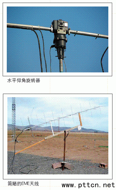 第二種是極軸架設(shè)。天線固定在一個(gè)主軸上,預(yù)先調(diào)整主軸安裝仰角角度和月亮軌道平面相垂直(注意不是和地面垂直哦)的位置上固定好,這樣只要單純旋轉(zhuǎn)主軸,就能在整個(gè)看到月亮的天空中跟蹤月亮。由于月亮在天空的移動(dòng)速度比較慢,大約每小時(shí)15°,因此,采用這種架設(shè)方法很容易用人工追蹤月球,只要你有足夠的體力跑來跑去調(diào)整天線的旋轉(zhuǎn)角度就行了,這可是強(qiáng)身健體的好方法。就算用電動(dòng)控制,也只需要采用一個(gè)天線旋轉(zhuǎn)器,只要坐在Radioroom(電臺(tái)室)里就能夠隨時(shí)控制天線對(duì)準(zhǔn)月球,多爽!第三種是兩軸架設(shè)。天線分別由水平方向(東南西北)旋轉(zhuǎn)器和垂直方向(仰俯)旋轉(zhuǎn)器控制(有的廠家把兩個(gè)旋轉(zhuǎn)器做在一起稱為水平仰角旋轉(zhuǎn)器)。采用這種架設(shè)方法的天線可以指向空中任意一點(diǎn),這是最普遍的EME通信天線的架設(shè)方法。受歡迎的原因是建造的方法清楚明白,不像極軸架設(shè)那樣需要設(shè)置極軸仰角角度(因?yàn)檫@個(gè)角度會(huì)隨著月亮的軌道平面相對(duì)地球赤道面作不停地?cái)[動(dòng)而變化,每天大約有2°的變化量,因此,每次運(yùn)用都要進(jìn)行調(diào)整)。但是,兩軸架設(shè)要有效地追蹤月球,需要同時(shí)調(diào)整方向角和仰俯角。所幸的是隨著個(gè)人電腦的普及,已經(jīng)有HAM開發(fā)出利用電腦控制兩軸旋轉(zhuǎn)器的跟蹤軟件和接口,只要在軟件中設(shè)置好電臺(tái)所在位置坐標(biāo),軟件會(huì)自動(dòng)從網(wǎng)上下載標(biāo)準(zhǔn)時(shí)間和月球準(zhǔn)確的軌道信息,軟件即可自動(dòng)計(jì)算和控制天線實(shí)時(shí)跟蹤月球,在整個(gè)EME通信的過程中,甚至都不需要人去干預(yù)。通過改變下載輸入的不同軌道參數(shù)信息,軟件還可以使天線用于跟蹤各種衛(wèi)星,從而使天線很容易地用于進(jìn)行衛(wèi)星通信。有的HAM嫌用電腦控制麻煩,干脆在天線上安裝一個(gè)小攝像頭,通過人工操作旋轉(zhuǎn)器使從攝像頭上看到的月亮影像在屏幕中間,由于月亮在天空的移動(dòng)速度慢,如此也能達(dá)到跟蹤月亮的目的。但這種方法在有密云或雨天時(shí)就無法應(yīng)用了。