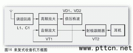這是一種直接放大式收音機。晶 體管VT1采用來復式電路結構,既是高 頻放大管,又是音頻放大管。晶體管 VT2構成射極跟隨器,起阻抗轉換與匹 配作用。可變電容器C1與L1組成調諧 回路,轉動C1即可調臺。 整機電路由調諧回路 、 高頻放 大、倍壓檢波、音頻放大和射極跟隨 器等部分組成,圖16所示為電路工作 原理方框圖。無線電調幅信號由L1、 C1調諧回路選擇接收后,進入晶體管 VT1進行高頻放大。放大后的高頻信號 送入二極管VD1、VD2進行倍壓檢波, 檢波后得到的音頻信號再次進入VT1進 行音頻放大,然后經VT2射極跟隨器驅 動耳機發(fā)聲。 高頻阻流圈L3 和電容C3完成高頻 信號與音頻信號的 分流。由于高頻阻流圈L3對高頻信號 阻抗很大,因此VT1集電極輸出的高頻 信號只能經C3至倍壓檢波電路進行檢 波。而VT1集電極輸出的音頻信號則可 經L3至VT2基極。