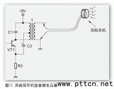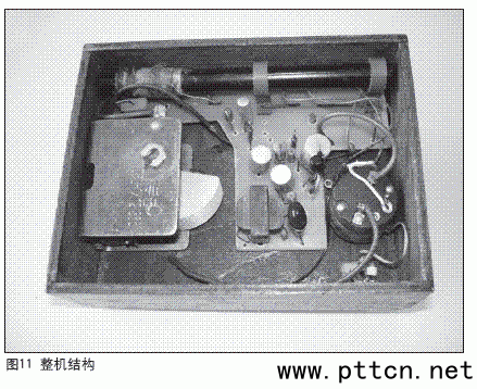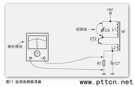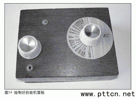 3. 調試 第一步,調整靜態(tài)工作點。調節(jié) R5 ,使R7上電壓降為0.5V。調節(jié)R1 , 使R3上電壓降為1V。 第二步,檢測電路是否起振。如 圖12所示,用高阻耳機接到音頻變壓 器T的次級,應能聽到"嘟——"的聲 音,說明音頻振蕩器已起振。如圖13 所示,用萬用表測量R7上的電壓,當 短路可變電容器C6時,萬用表表針應 有擺動,說明高頻振蕩器已起振。如 電路未起振,應重 點檢查音頻變壓器 T或磁性天線W的 引線是否搞錯。 第 三 步 , 校 準頻率覆蓋范圍。 可用標準頻率計來 校準,轉動可變電 容器C6,振蕩頻 率應能覆蓋450~ 1800kHz。如低端 頻率偏高,可將磁 性天線線圈向磁棒中間移動。如高端 頻率偏低,則將天線線圈向磁棒頂端 移動。 如無頻率計 , 可用一臺頻率刻 度準確的超外差中波收音機,打開電 源,調諧旋鈕調到1600kHz附近,放在 信號發(fā)生器旁邊接收信號。將信號發(fā) 生器的C6旋出3°~ 5°,來回移動天 線線圈在磁棒上的位置,直至收音機 中發(fā)出清晰的800Hz的"嘟——"聲。 這時轉動收音機的調諧旋鈕,收到的 "嘟——"聲應不變,說明465kHz中 頻已校準。收音機在930kHz處應能收 到中頻的二次諧波。如此調整后,信 號發(fā)生器即已能覆蓋450 ~ 1800 kHz頻 率范圍。將各頻率點標注出來,再繪 制成正式的頻率刻度。整機面板如圖 14所示。