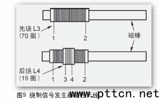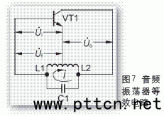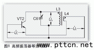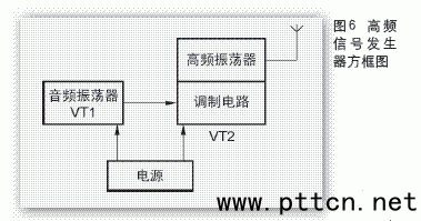 1. 電路原理 圖 5是高頻信號發(fā)生器電路圖。 電路由音頻振蕩器、高頻振蕩器、調 制電路和電源電路等部分組成,如圖 6方框圖所示。高頻振蕩器產生載頻 信號,載頻頻率可根據需要在450~ 1800 kHz范圍內選擇。音頻振蕩器產生 約800Hz的音頻信號,去調制高頻振蕩 器,使載頻信號的振幅隨音頻信號振 幅的變化而變化。調幅波由天線輻射 出去。 晶體管VT1與音頻變壓器T、電 容器C1等組成音頻振蕩器。這是一個 共基極電感三點式振蕩器,具有容易 起振、振蕩頻率較穩(wěn)定的特點,其等 效電路如圖7所示。音頻變壓器T的初 級線圈L1與電容器C1構成諧振回路, 起到選頻作用,并將輸出電壓U o移相 180°后反饋到輸入端,使反饋電壓U f 與輸入電壓U i同相,實現了正反饋,電 路振蕩。振蕩頻率f由L1、C1諧振回路 決定,即f =1/2p L 1C 1»800 Hz ,振蕩 電壓經音頻變壓器T的次級線圈輸出。 晶體管VT2與磁性天線W、可變 電容器C6等組成高頻振蕩器。這是一 個共基極變壓器耦合振蕩器,其正反 饋是通過反饋線圈L4來實現的,具有 容易起振、輸出振蕩電壓較大、調節(jié) 頻率方便的特點,其等效電路如圖8所 示。在高頻振蕩管VT2集電極接有L3 與C6構成的諧振回路,決定了振蕩器 的振蕩頻率。L3與L4同繞于一根磁棒 上,形成變壓器耦合。L4將輸出電壓 U o反相后輸入晶體管VT2的基極,反饋 電壓U f與輸入電壓U i同相,電路振蕩。 L3、L4同時構成磁性天線,直接向外 輻射輸出。 變壓器T次級線圈輸出的音頻信 號經C4耦合至VT2基極,與其基極偏 置電壓迭加,使其集電極電流隨之變 化,最終結果是VT2產生的高頻振蕩 信號幅度隨音頻信號而變化,實現了 調幅。 2. 元器件選用與制作 音頻變壓器T選用晶體管收音機 的推挽輸入變壓器,將原次級(3條引 線)作為初級,原初級(2條引線)作 為次級。為縮小體積,電源采用9V層 疊電池。 磁性天線需自行繞制。如圖9所 示,選用一根直徑10mm、長100mm 左右的磁棒,用牛皮紙在磁棒上做一 個可以來回滑動的骨架,用多股紗包 線(也可用漆包線)在骨架上密繞70 圈作為L3,開頭為"1"端,結尾為 " 2"端。 在L3上纏一層牛皮紙,用相 同的紗包線或漆包線在其上按同方向 密繞15圈作為L4,開頭為"3"端,結 尾為"4"端。 安裝完成的電路板如圖10所示, 整機結構可參考圖11。