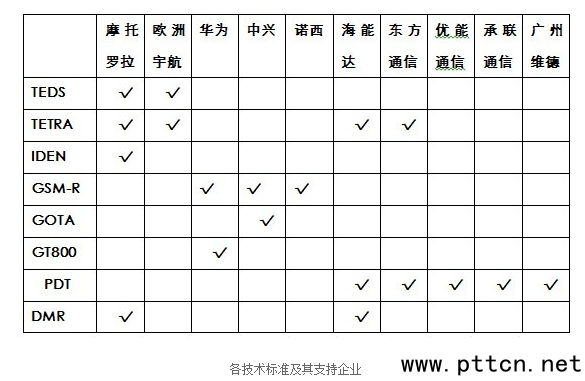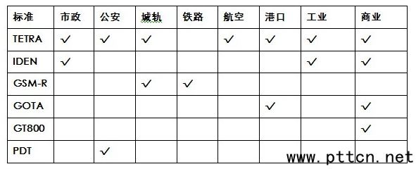 PDT技術(shù)標(biāo)準(zhǔn)剛起步只應(yīng)用于公安領(lǐng)域。 PDT又稱為警用數(shù)字集群,是在我國(guó)公安部的倡導(dǎo)下研制出來(lái)的,該技術(shù)標(biāo)準(zhǔn)是在2010年發(fā)布的,并在當(dāng)年成立了PDT產(chǎn)業(yè)聯(lián)盟。2011年10月10日,公安部科技信息化局印發(fā)了《警用數(shù)字集群(PDT)通信系統(tǒng)總體技術(shù)規(guī)范(試行)》(公科信[2011]122號(hào)),開始試行PDT技術(shù)體制,到目前在全國(guó)已經(jīng)建設(shè)了近30多個(gè)PDT專網(wǎng)。我國(guó)公安部已確定PDT集群標(biāo)準(zhǔn)為公安系統(tǒng)模轉(zhuǎn)數(shù)主要采用數(shù)字集群標(biāo)準(zhǔn)。 GOTA和GT800兩標(biāo)準(zhǔn)商用不理想。 在2004年中興推出數(shù)字集群通信技術(shù)GOTA,華為推出GT800。同年11月,我國(guó)信息部確定中興Gota和華為GT800共同成為我國(guó)集群行業(yè)參考技術(shù)標(biāo)準(zhǔn)。。總體來(lái)看,不論是市場(chǎng)規(guī)模還是市場(chǎng)活躍程度GT800都不如GOTA。 IDEN技術(shù)在我國(guó)發(fā)展近乎停滯。 雖然在2000年的時(shí)候我國(guó)信息產(chǎn)業(yè)部將IDEN定位數(shù)字集群行業(yè)標(biāo)準(zhǔn)也就是B標(biāo)準(zhǔn),但是IDEN技術(shù)在我國(guó)的發(fā)展似乎停滯了,現(xiàn)有的幾個(gè)網(wǎng)也都是在2004年之前建立的 TETRA技術(shù)標(biāo)準(zhǔn)所應(yīng)用的行業(yè)最廣發(fā)展也很迅速。 TETRA技術(shù)標(biāo)準(zhǔn)在1995年由歐洲ETSI發(fā)布,在2000年,我國(guó)公布A標(biāo)準(zhǔn)和B標(biāo)準(zhǔn)作為我國(guó)數(shù)字集群行業(yè)標(biāo)準(zhǔn),其中A標(biāo)準(zhǔn)就是TETRA標(biāo)準(zhǔn)。2000年摩托羅拉為廣州地鐵建設(shè)第一個(gè)TETRA專網(wǎng),此后TETRA迅速的應(yīng)用在我國(guó)的各個(gè)行業(yè)領(lǐng)域。截至到2006年全國(guó)共建設(shè)了42個(gè)TETRA系統(tǒng)網(wǎng)絡(luò),而到2009年,TETRA專網(wǎng)已經(jīng)超過90個(gè),而當(dāng)前TETRA網(wǎng)已達(dá)200個(gè)。 除此之外還有聯(lián)拓的ARC標(biāo)準(zhǔn),海格天立通的THA標(biāo)準(zhǔn)。其中PDT、THA延續(xù)了DMR的思想,而聯(lián)拓方案采用了完全自主的體制。但這兩種應(yīng)用范圍非常小。