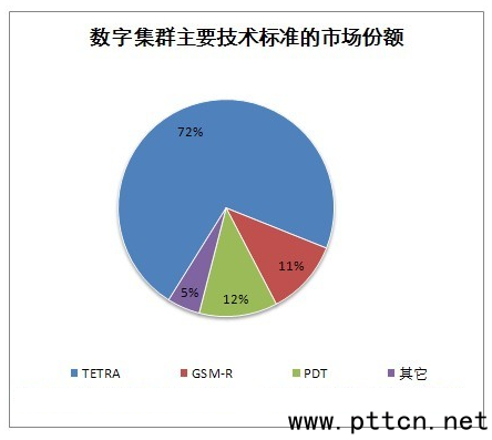 TETRA技術(shù)占據(jù)最大的市場(chǎng)份額,居于絕對(duì)領(lǐng)先地位。 根據(jù)統(tǒng)計(jì)顯示,當(dāng)前TETRA網(wǎng)約占全國(guó)數(shù)字集群現(xiàn)網(wǎng)規(guī)模的72%,遠(yuǎn)高于其它數(shù)字集群標(biāo)準(zhǔn) 數(shù)字集群后起之秀——PDT標(biāo)準(zhǔn)。 PDT標(biāo)準(zhǔn)是在2008年開始研發(fā),2010年正式發(fā)布的,經(jīng)過兩年多的時(shí)間PDT就擁有了12%的市場(chǎng)份額,足見其發(fā)展速度。再者PDT是在我國(guó)公安部牽頭下研發(fā)出來(lái)的,并公安部已經(jīng)確定PDT標(biāo)準(zhǔn)為我國(guó)公安領(lǐng)域數(shù)字集群建設(shè)采用的主要標(biāo)準(zhǔn),并且制定出了具體的發(fā)展規(guī)劃,規(guī)劃指出2013年到2014年為PDT集群標(biāo)準(zhǔn)的推廣階段;2015年為強(qiáng)制過渡階段,最終要在“十二五”末基本形成全國(guó)聯(lián)網(wǎng)、統(tǒng)一網(wǎng)管的公安數(shù)字應(yīng)急指揮通信專網(wǎng)。